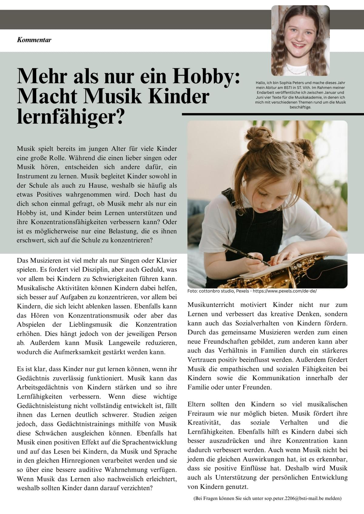 Den Anfang macht eine angehende Abiturientin, die sich in ihrer Abschlussarbeit intensiv mit der Wirkung und Bedeutung von Musik beschäftigt hat. In ihrem ersten Beitrag beleuchtet sie, wie Musik die Lernfähigkeit von Kindern positiv beeinflussen kann.